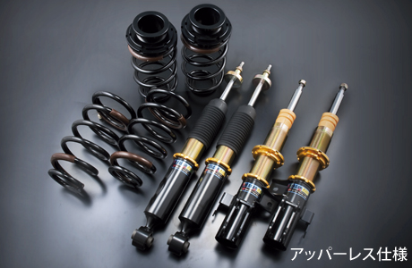 複筒式ショックを採用することによりストローク量を増やし、しなやかな足回りセッティングとしました。 また、純正アッパーマウントを流用することで、直巻スプリングのゴツゴツ感を解消するアッパーレス仕様も 選択できます。 美しいローフォルムを実現しつつ、同乗者にも優しいフレキシブルなサスペンションキットです。
